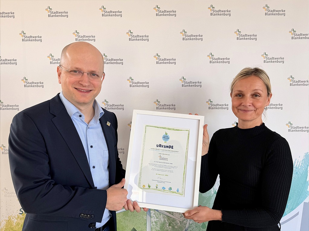 Ob Ökostrom, E-Mobilität oder regelmäßiges regionales Engagement für diverse Vereine und bei zahlreichen Veranstaltungen im Stadtgebiet: Die Stadtwerke Blankenburg tragen auf vielfältige Weise dazu bei, die Lebensqualität in der Stadt und den zughörigen Ortsteilen hochzuhalten. Dazu gehören auch eine nachhaltige Energieversorgung sowie die persönliche Beratung und Unterstützung der Kund*innen vor Ort, telefonisch oder per E-Mail. Im November 2025 wurden die Stadtwerke Blankenburg für Ihr Engagement mit dem Gütesiegel „Klimafreunde“ ausgezeichnet.